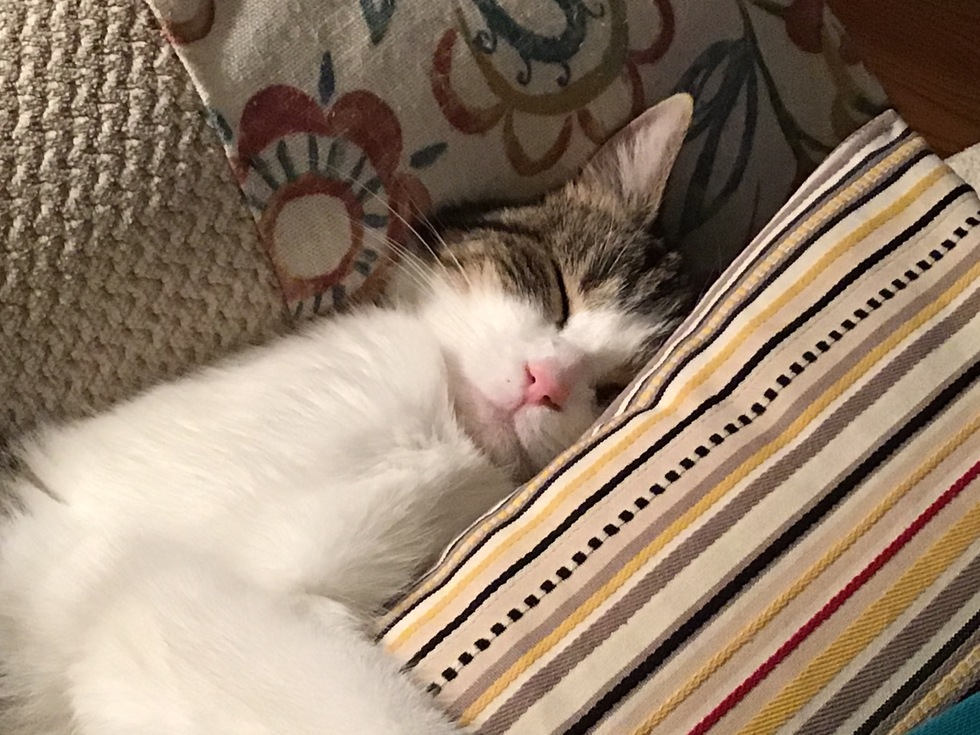 Once upon a time, a pretty cat we call Miss Daisy had a litter of 5 kittens on someone’s porch. The home owner called Stray Cat Blues. The kittens were all adopted and I met Miss Daisy May of 2020. Love at first sight. We were told if we wanted a lap cat, this would not be a good match. She was such a shy cat. I took a photo of the first time Miss Daisy climbed into my lap and I sent it to her foster mom in an email. She answered my email saying she was so happy to have been wrong. And we lived happily ever after.