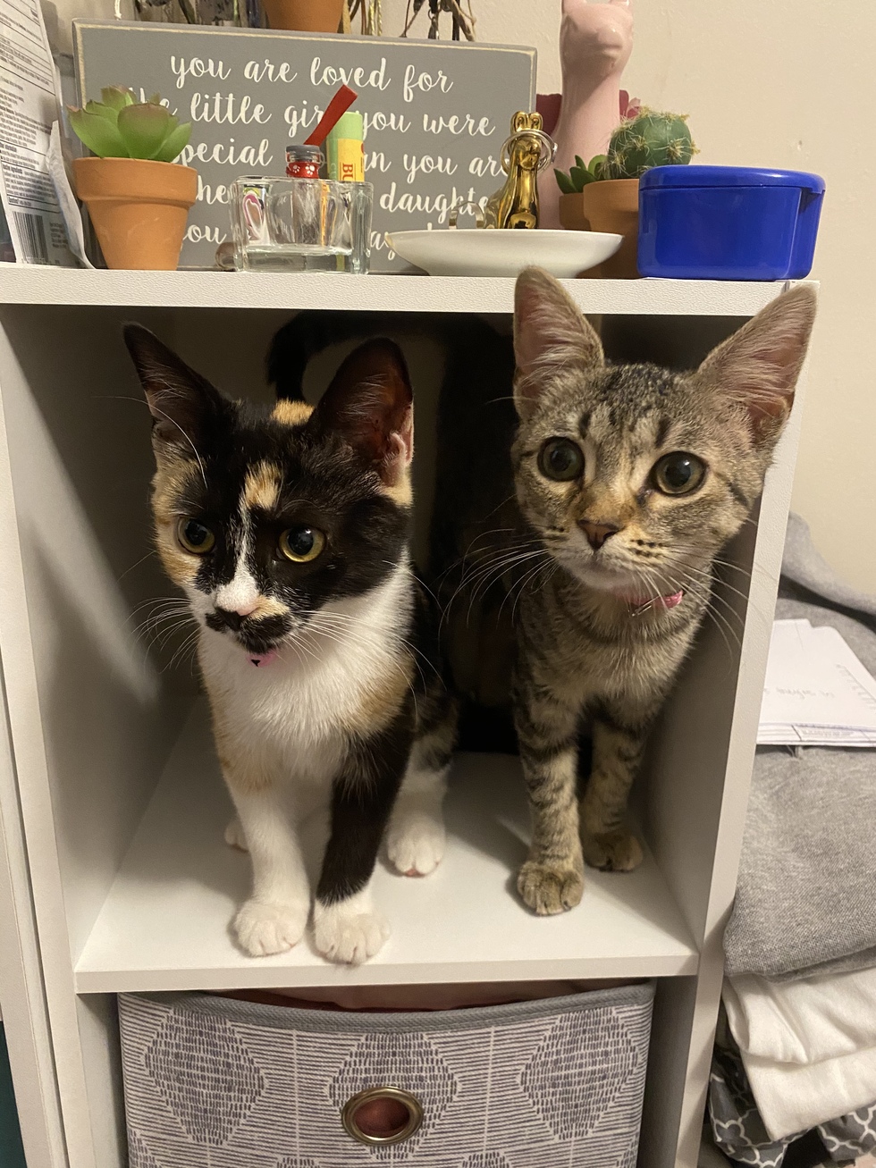 Chloe (nicknamed “Chwoe bear”) is our beautiful spoiled tabby who loves her treats and to nap in her window seat. Pumpkin (nicknamed “Punky fluff butts”) is our fluffy, nimble, calico who loves to play and crawl on your chest while you sleep. These bonded girls are so smart, we taught them both to “give high fives” for treats!