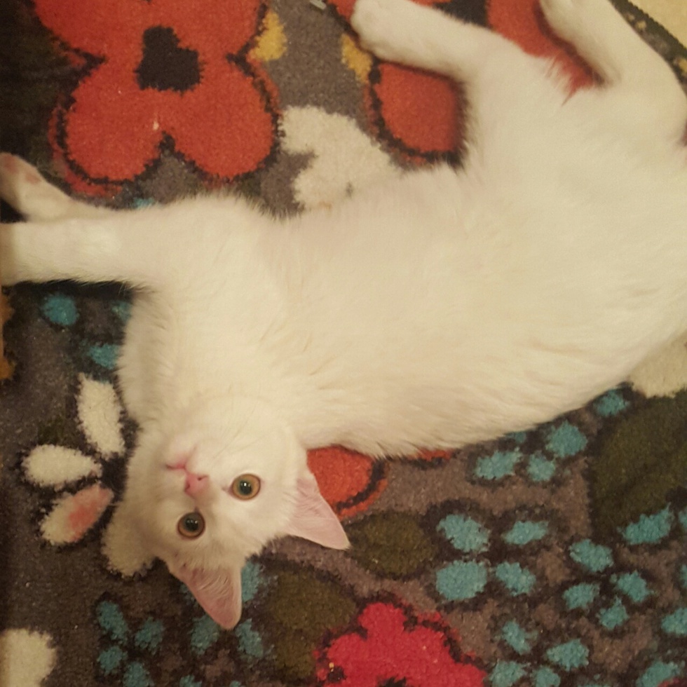 Snowy was a street cat we adopted. She walked right over and crawled up my son's leg to play and I knew she was the one I wanted. She now terrorizes her older brothers at home.