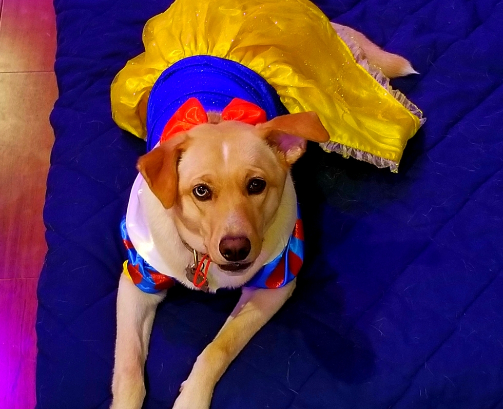Dog's Story or BioWhen her mom's birthday trip to Disneyworld was cancelled right at the beginning of the pandemic, Jolyne gladly stepped in as Snow White to help offset the disappointment. JoJo has an upbeat attitude that we attribute to her history as a Stop the Suffering dog. She and her litter were born feral, and JoJo was rescued and fostered until her adoption in the summer of 2019. She is energetic and loving with a true joie de vivre. She sniffs like a sleuth, has a unique prance similar to equestrian dressage, and has a smile for everyone. Her blue-white eye always earns her a second glance. Thanks to a doggy DNA test, we were able to determine that JoJo is 1/4 beagle, 1/8 lab, 1/8 husky, and a whole lot of mutt!