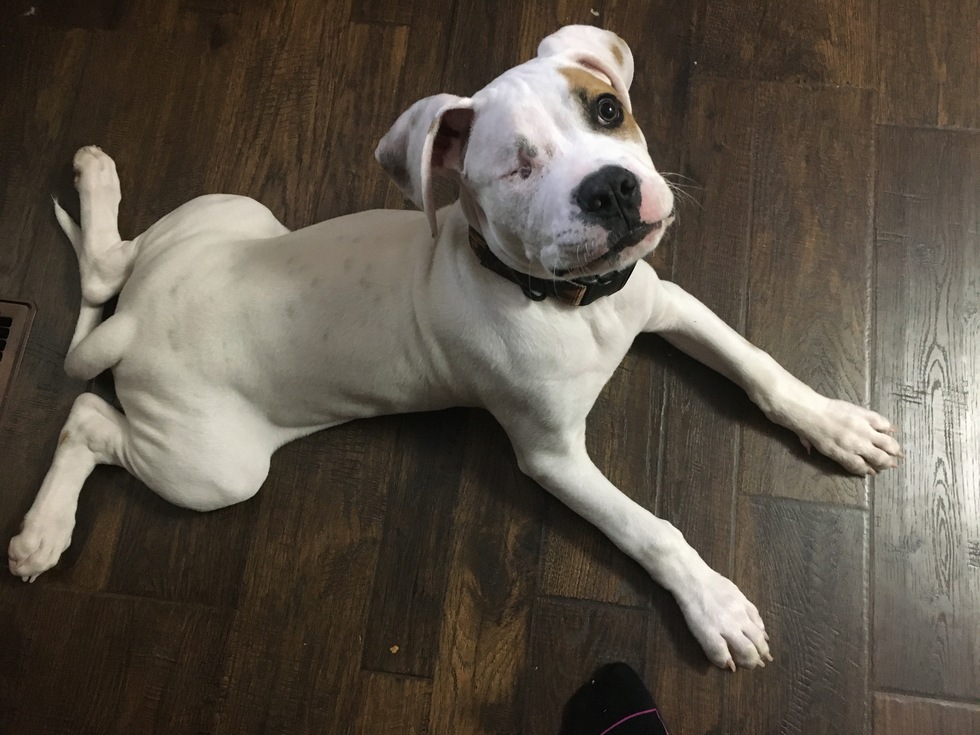 Dog's Story or BioWe adopted Simon at 8 weeks from STS. He was born without a fully developed eye so he has undergone a hernia surgery and an eye surgery in his young life, but he is thriving. He loves to hang out on his bed with his people. He knows sit, stay, down, shake, high-five and leave it and is eager to learn more. Simon is the best one-eyed dog ever!