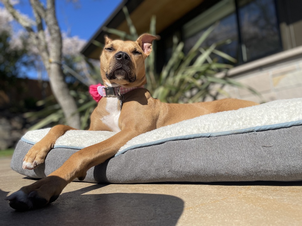 Ellie is a rescue from Texas who transformed our home from cat-only to dog friendly. She's a sun loving girl who spends her sunny days on the patio and her grey days snuggled next to her family. She has stolen our hearts!