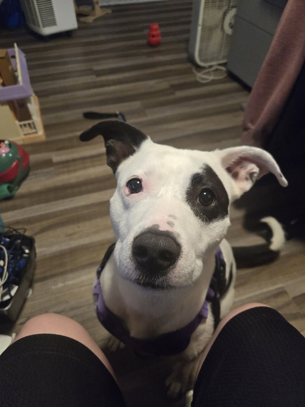 This is Jasmine Yzma. She was adopted from the HSTPC 2 years ago this year. She was a very shut down and fearful girl especially of men and children. With time with dedicated hs staff and volunteers she learned to trust females including myself who is a staff member when she came to the shelter. She has made great strides and is continuing to grow and working on trusting people. She loves her La La,my mom, and her momma,me. She got more toys and loves her stuffies like her Cow and Lambchops to cuddle with.