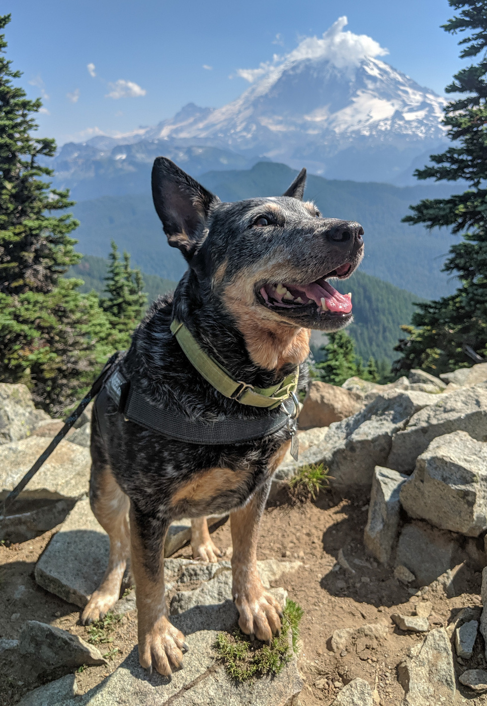 Juno is an Australian Cattle Dog, originally found on the mean streets of Texas, she was rescued in 2017 by her current family through the fine folks at PAWS Lynnwood. Living in Tacoma since 2020, she has aged gracefully into her senior years. Once adventurous hikes and agility runs are now slow walks around Puget Sound parks, cuddles on the couch, and soaking up the sun in a grassy field.