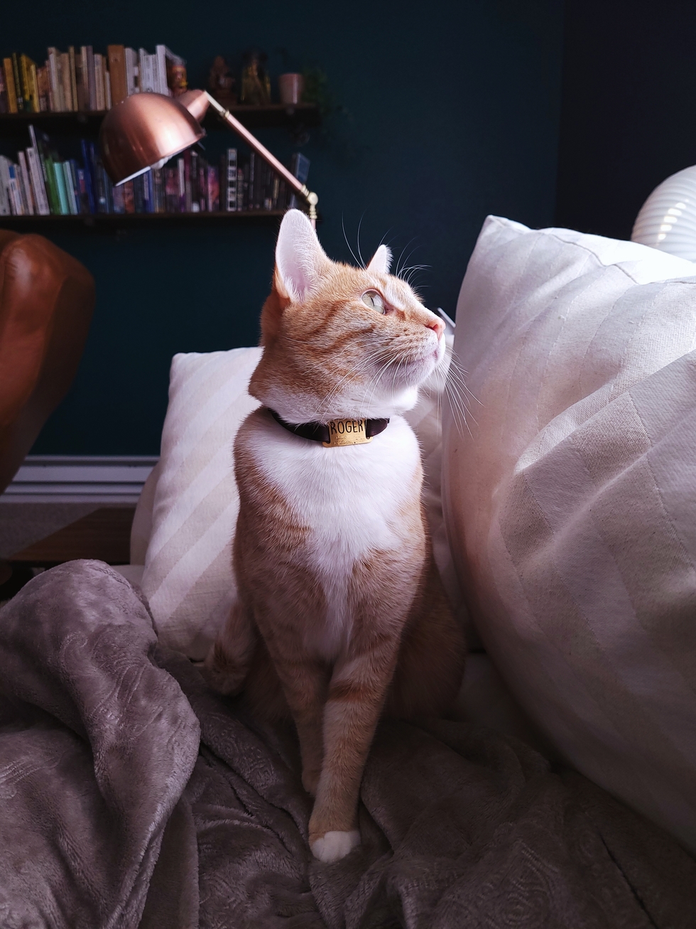 Pet's Story or BioRoger came to us as a foster from Tacoma Humane, along with her three, 4 day old kittens. She was such a great mom and clearly understood that we were there to help her and her babies. Every time we brought them food or water she would pur and nuzzle us. She needed some momma time too though, every evening around 7pm she would take a break from the little ones and come downstairs to curl up with us and get snuggles and pets. I fell in love with her and decided that we had to keep her. We adopted her and one of her babies and she is the coolest cat I've ever met. She still always shows up for her evening cuddle sesh.