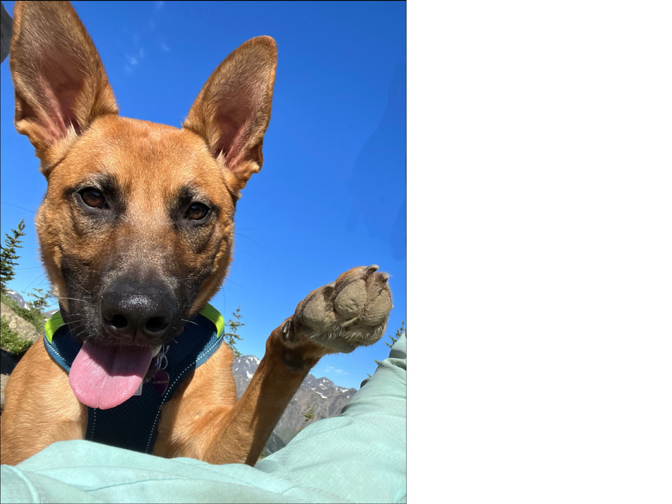 Pet's Story or BioPenny was born in a shelter on Veteran's Day in 2021. We met four months later. I was actually there to meet her sister, but Penny was the pup who hung out with us and tried to follow me out the door. She became a permanent family member a few days later. Penny is an ardent hiker pup who hates water, loves tennis balls, and is in heavy training to become a flyball superstar. Her boundless energy and happy-go-lucky nature are clearly reflected in this high 5 at the top of Marmot pass from a backpacking trip we took last summer.