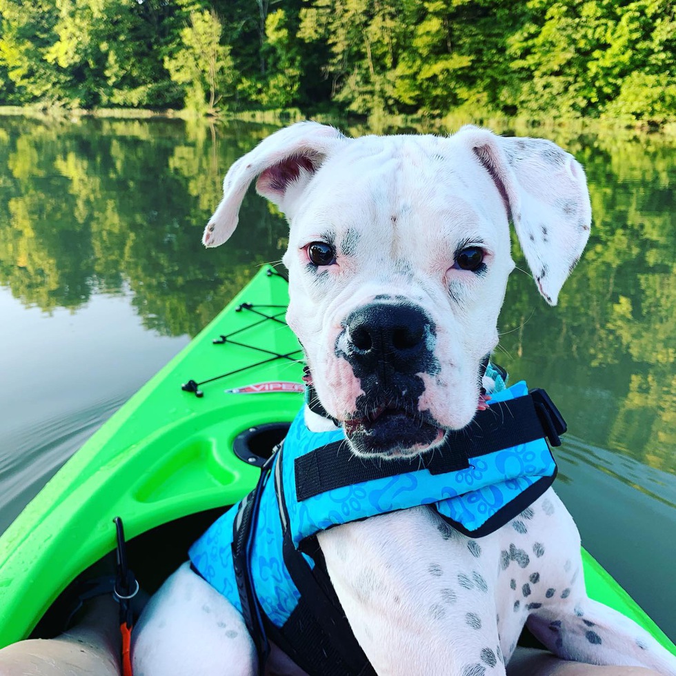 Moxie came to us from Creekside Rescue. She had been given to the rescue because “she kept escaping.” We brought her home and immediately channeled her energy into outdoor activity. When it’s cool out, she runs 4-6 miles with me and when it’s hot, we go kayaking! She spends as much time in the water as she does in the kayak. We love her independent spirit and mischief making. She lives up to her name!