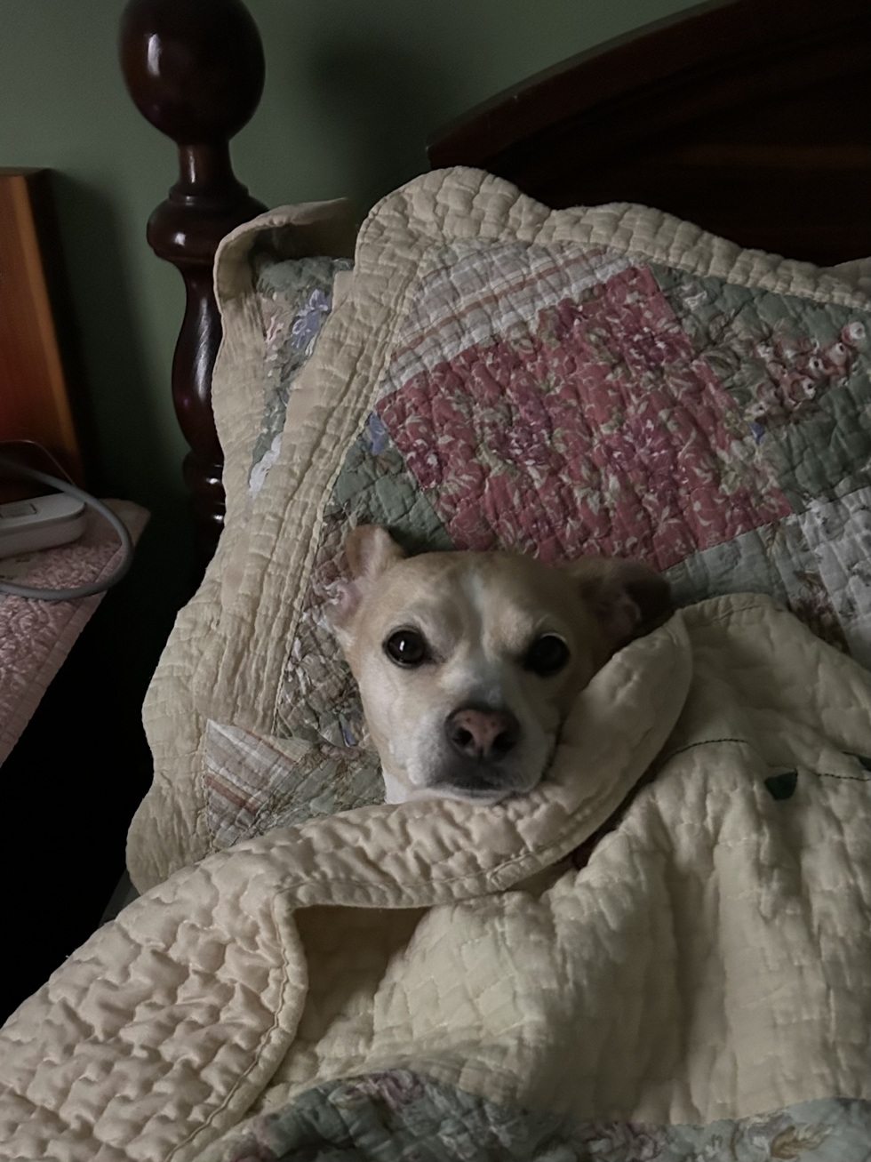 Radar stole my heart with his calm demeanor. He has freckles on his heart shaped nose. He is so much a “people person”. He walks great with me as I use a walker to go about our complex. When my husband went in for triple bypass surgery, it was wonderful that Radar was here to offer me comfort.