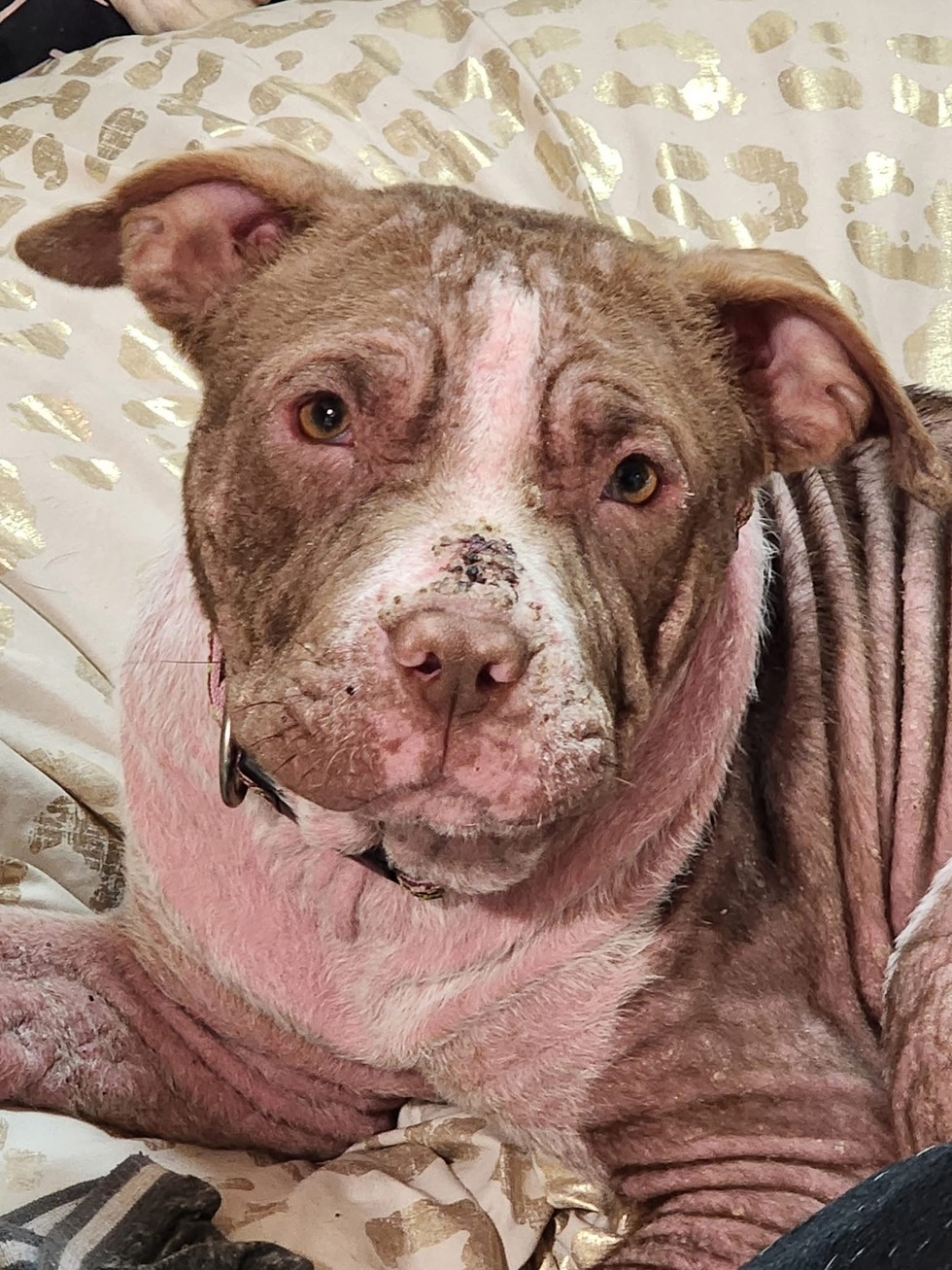 Willow Ember is a little warrior with a heart as big as her wrinkles. After surviving severe neglect and battling demodex mange, she’s now on the road to recovery—soaking up love, soft blankets, and every belly rub she can get.