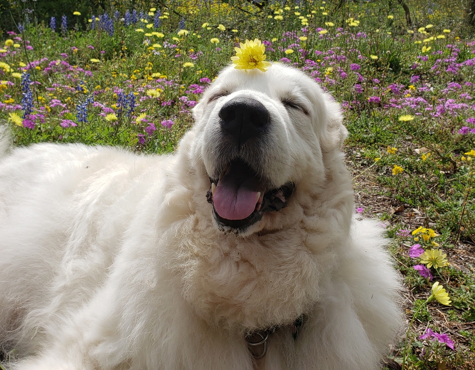 Beaujolais came to us about 8 years ago from TGPR. I believe we are her fourth but final home. She loves to chillax in the back yard with our chickens and to "protect" us from falling leaves and acorns and from the scary deer and squirrels. She is entering her twilight years as a dignified old lady who breaks the sound barrier with her snoring. This picture captures her beautiful heart and soul.