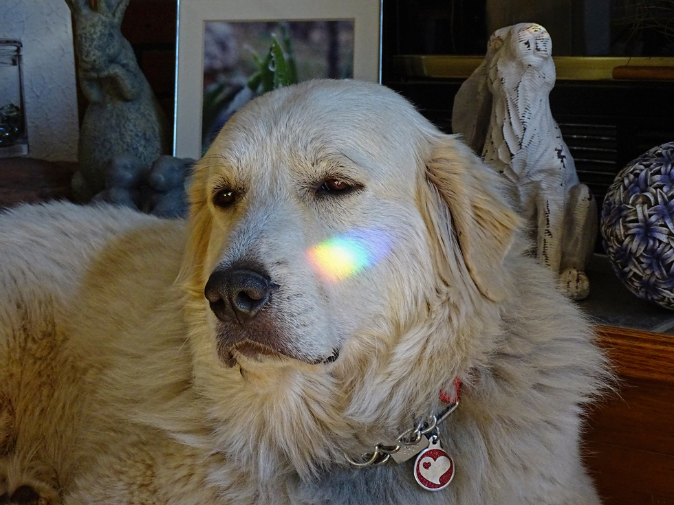Nerys came to us as a rescue from a loving home but an unfortunate circumstance. when I saw her birthday was the same as mine i knew it was a sign she was meant to be with me. she is so loving and so much loved. last September I had a massive stroke. I got home in November with much healing still to do. Nerys has been by my side and is my reason to get well again.She is so gentle and knows I need her as much, if not more than she needs me.Our morning cuddles are our special time together. The Rainbow on her face is made from the light of crystals that hang in my windows. Nerys gives the Rrainbow joy to me and all others she meets. Her name is Welsh Gallic for "White Lady" .My beautiful : Rainbow Girl"