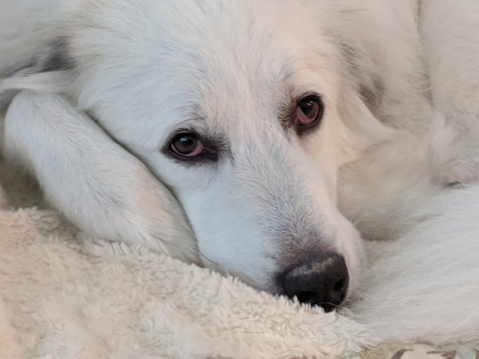 Artemis is the quintessential Pyr who is very mellow most of the time but ready to scare away any intruder (real or imagined) with her ferocious bark at a moment's notice. She is fiercely loyal to her people and tolerates her fur siblings with remarkable patience. She takes some time to warm up to new people, but once she does, she is the sweetest, most loving companion you'll ever have.