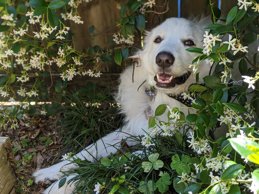 Baker is a great companion, loves chewing cardboard, peanut butter treats, and barking at motorcycles. He has found a hideout in backyard between fence and Jasmine bush, very proud of himself!