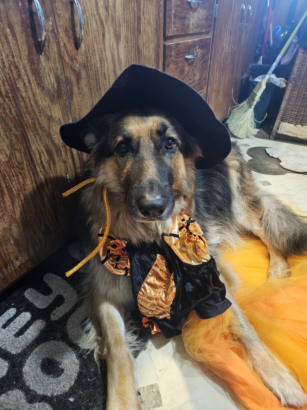Zoey is 4 1/2 years old. She is full of life as her name suggests. She is loving, loyal and has many playful antics. She is very good with her 2 kitties and she loves her brother, who is also a long-haired German Shepherd. The poor little thing loves her walks so much that she has already had an ACL tear. Had her surgery, last year, right before Halloween. It was so sad because she couldn't walk a lot for 12 weeks. She loves trying to chase bunnies and squirrels. Thankfully she can only get so far or she would likely give them a run for their money. She is smart as a whip and she teaches us a lot about life every day. Love her to the moon and back. She wants me to clarify that just because she is dressed like a witch, this doesn't mean she is one.