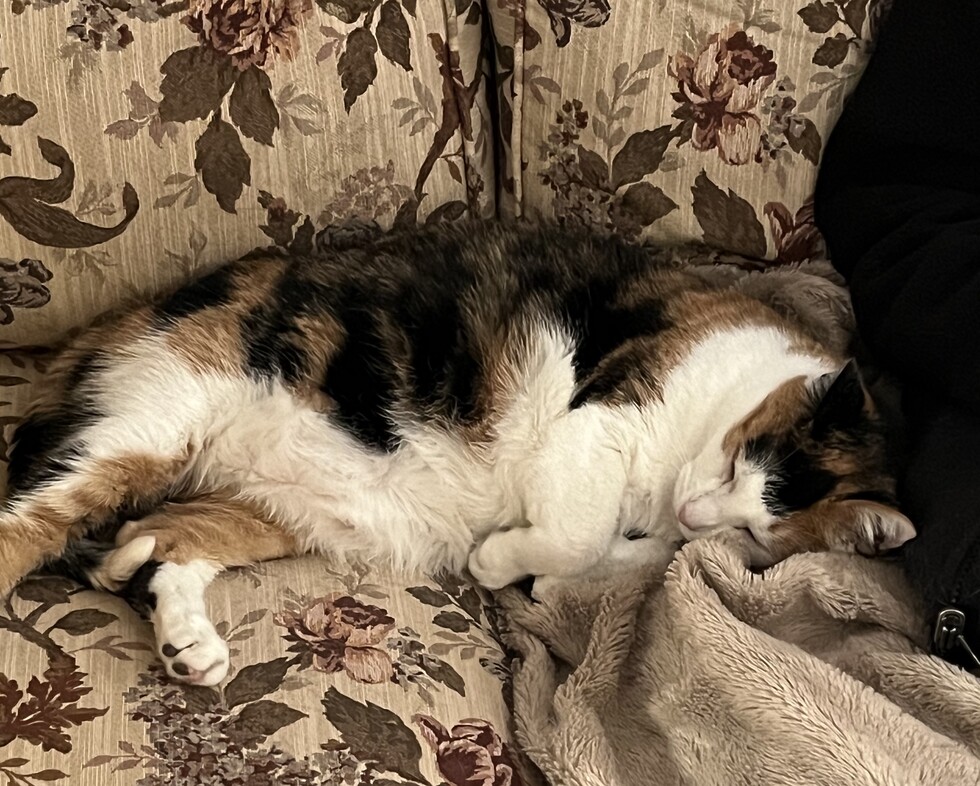 Miss Noogie now spends her time sleeping on my couch, while keeping a close eye on what is going on around the house. She shares her space by cuddling up next to whatever two-legged decides to join her. She loves it when company stops by and pays her some attention.