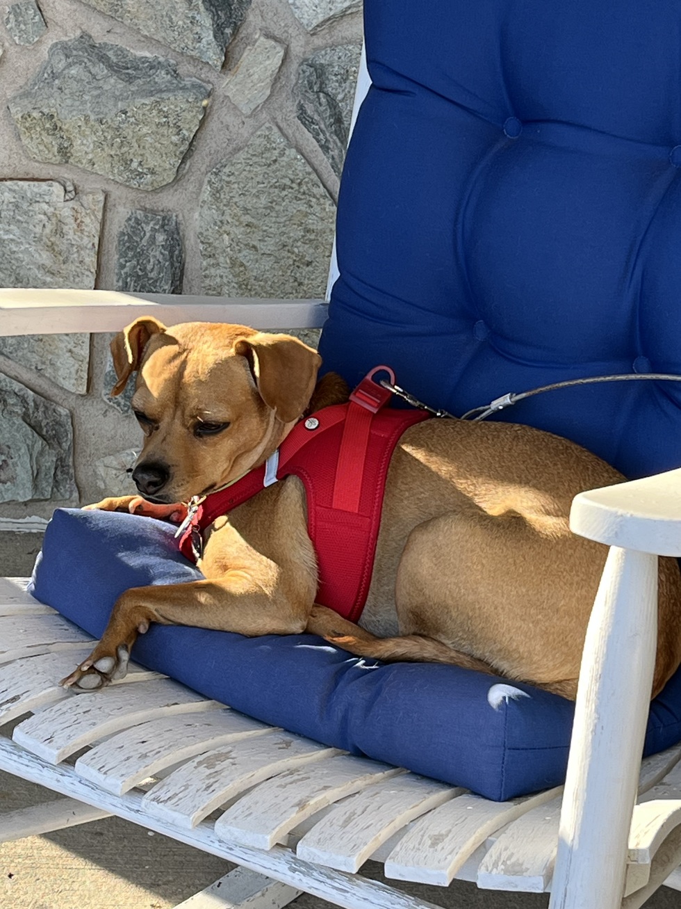 Now, she’s the talk of the neighborhood, she’s sweet, outgoing, and full of energy! I think she might be the only dog around with her own rocking chair, where she loves to sit and watch for squirrels, deer, and keep an eye on the neighbors.