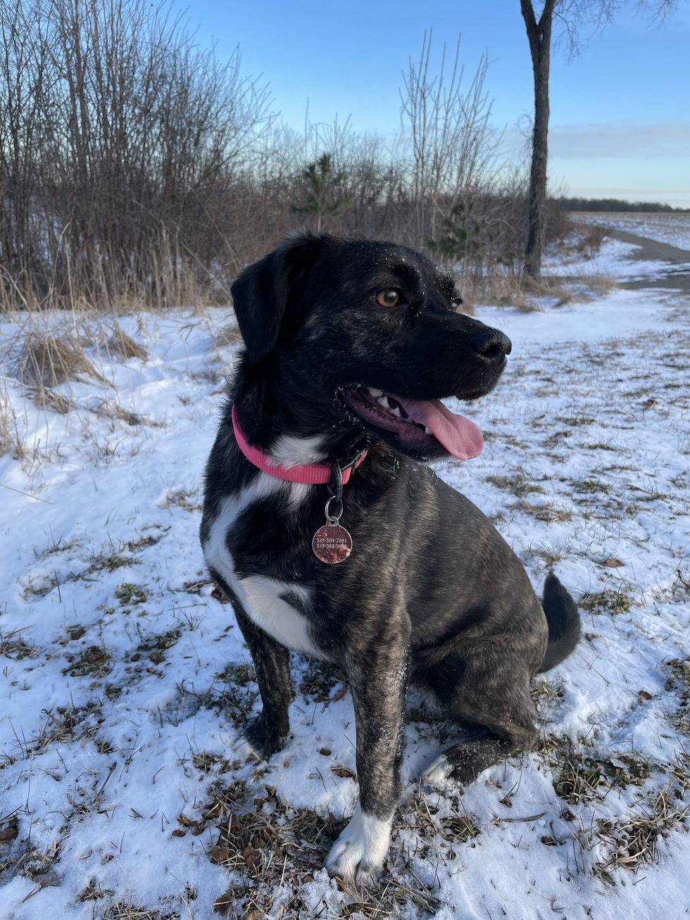 Miss. Piggy is a Heinz 57 mystery mix breed, who’s a graduate from DRS who was rescued from an intense situation in Aruba as a 6 week old pup. She started her journey to a new life in Manitoba before being transferred to DRS after she was 8 weeks old. Piggy’s character lives up well to her name! She loves to eat, roll in the dirt (or anything smelly, especially on her neck) and has a super cute curly tail. What’s also pretty accurate is that she squeals like a pig when she’s really close to catching a squirrel or other critter when running in the backyard. But she never quite does catch them! We love our little island pup dearly and can’t wait to see her thrive in agility training and barn scent hunts. ❤️