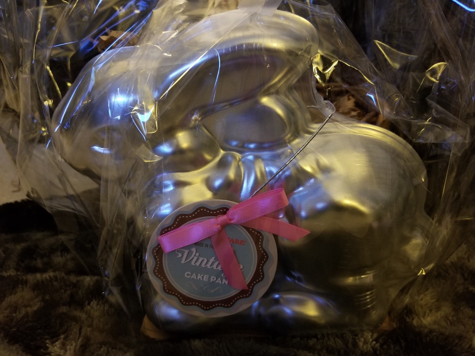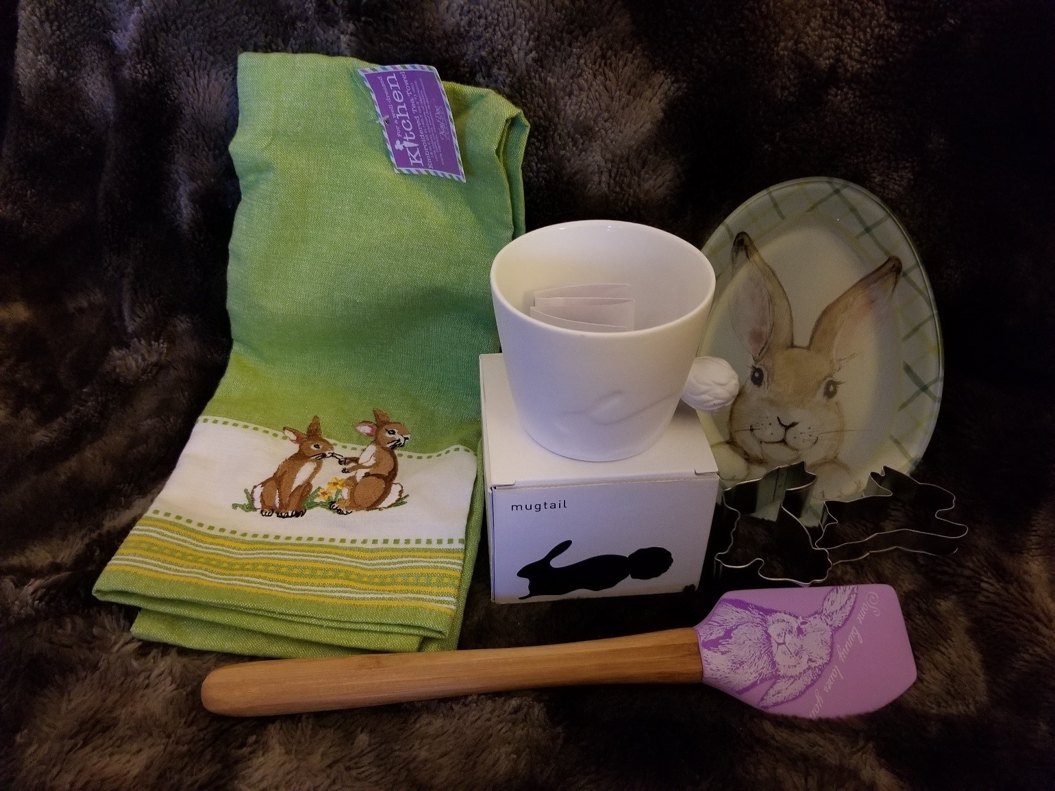 Bunny Baking Themed Gift Basket including rabbit cake pan, dish towels, glass plate, set of mugs with rabbit tail, rabbit spatula, and two rabbit cookie cutters.