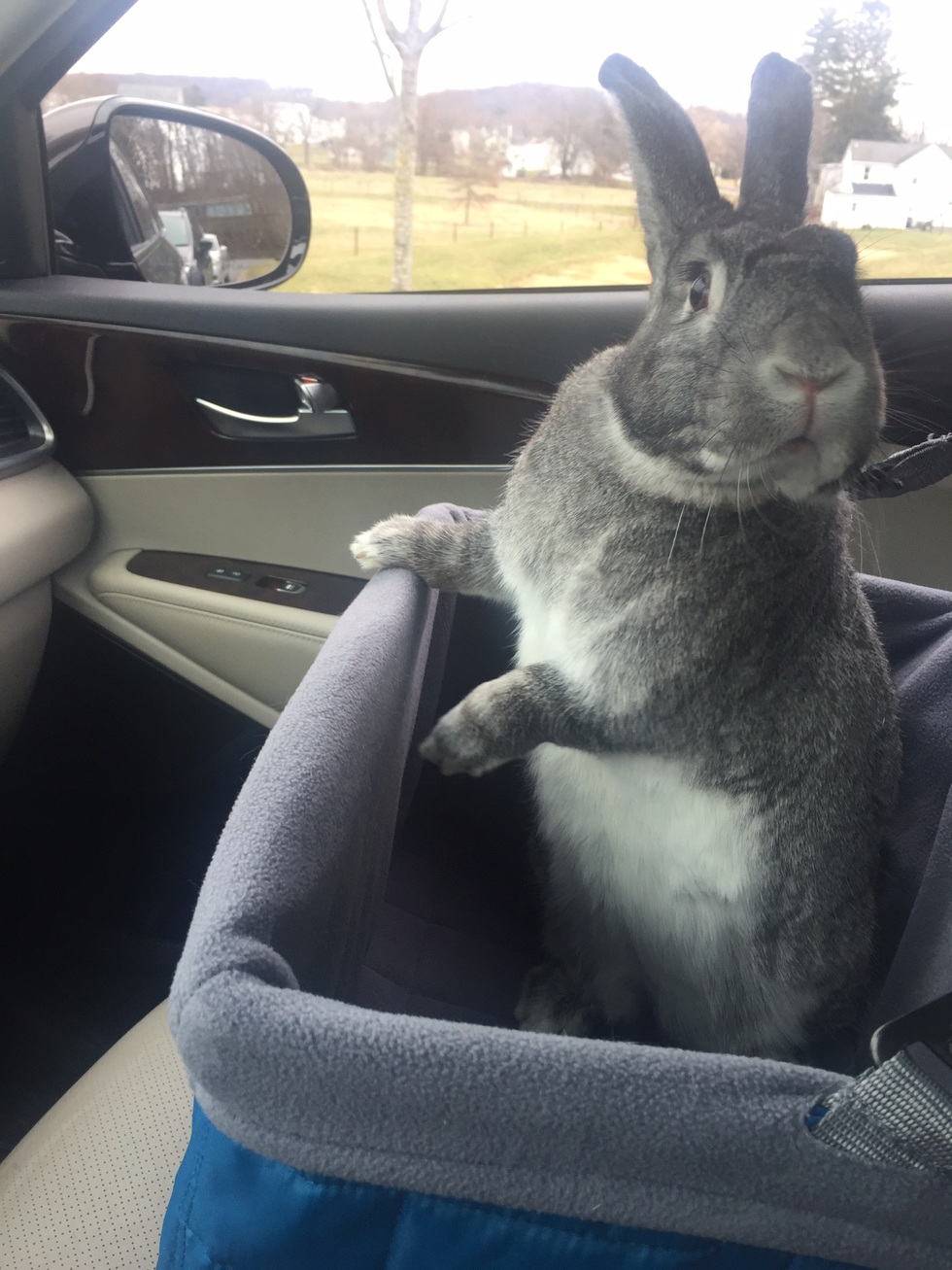 Goob is a 3 year old New Zealand that we adopted from the House rabbit society in Delaware. He is currently working on becoming a visiting therapy rabbit. He loves car rides, and long stroller rides around the neighborhood visiting everyone.
