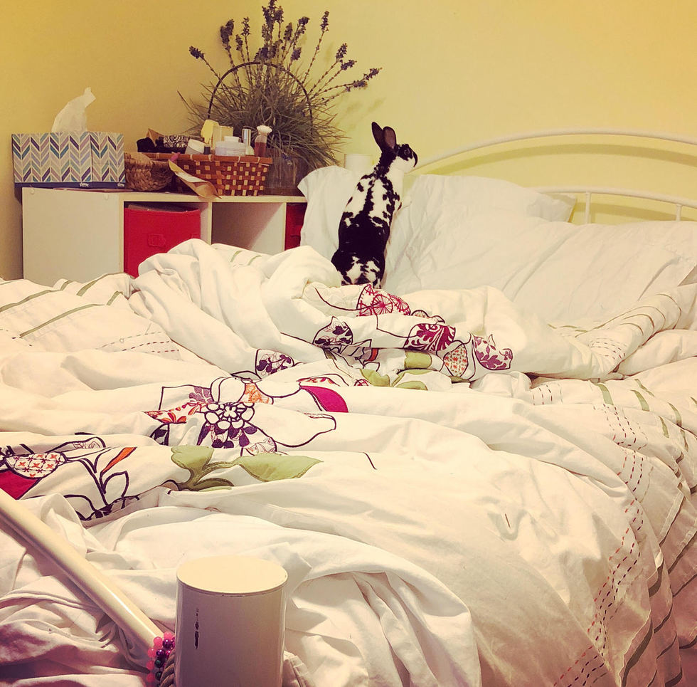 Diana Sophia, or "Moo-moo" as she is affectionately called by her human, is a small but mighty, sassy, free-run mini-rex who was came from Indiana House Rabbit Society after a large mini-rex confiscation. In her free time she enjoys sleeping, grooming the love of her life, her stuffed dog, waking her human exactly 2 minutes before her alarm clock everyday (her internal clock is remarkable), and obsessively grooming her human best friend and life partner! Diana Sophia prefers savory foods, such as kale, and thinks her human is trying to poison her every time she's offered a banana. Diana Sophia is very soft, and is currently learning how to be a doctor with her human, as her human studies with her every night. Diana Sophia and her humans just celebrated their 4 year adopt-a-versary and look forward to cherishing each other for many years to come.