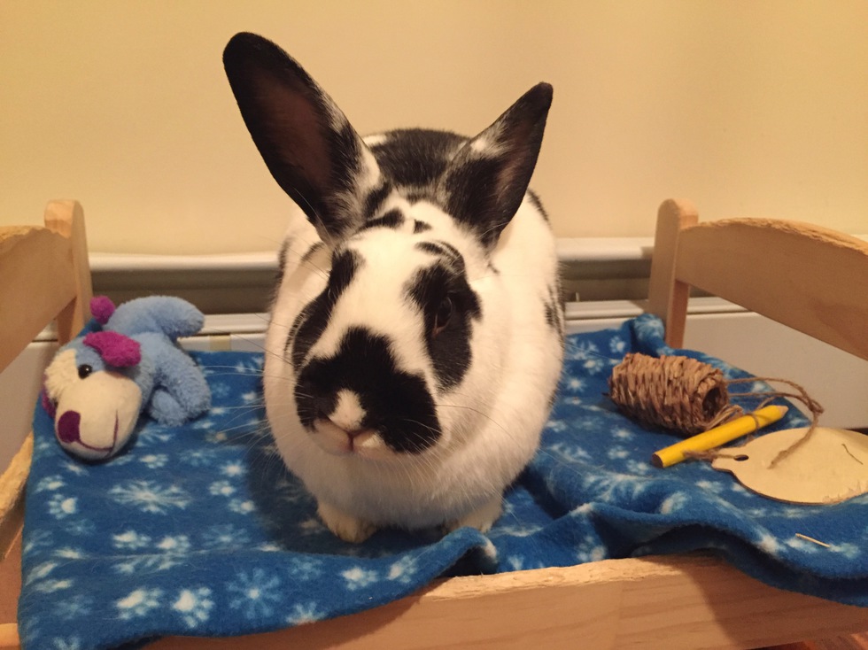 Dottie is a 4-year-old New Zealand mix living in Argyle, NY with her husbun, Roo. She is quite food aggressive and a little nippy if you don’t feed her fast enough, but is otherwise a joy to be around. She enjoys cuddles and kisses and sometimes gives kisses in return, but very sparingly. She rules the roost, despite her husbun’s efforts to be the dominant rabbit.