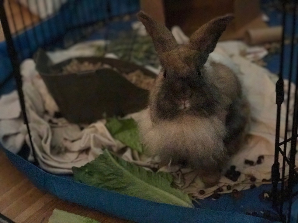 He now lives with us in Rochester, and is a handsome angora boy with long flowing fur. He binkies bigger and crazier than any bun I know. His favorite food is hay and his favorite hiding spot is under the Christmas tree. He’s the sweetest boy and always snuggles on the couch with me before falling asleep each night.