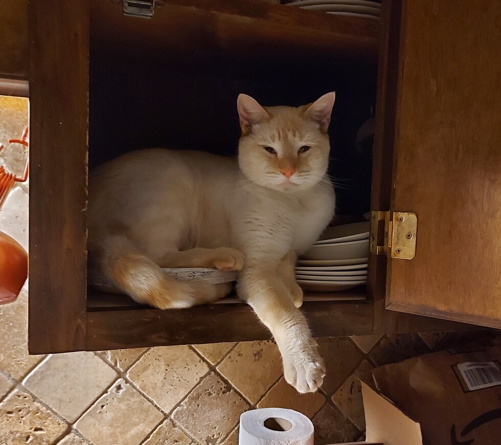 Crowley originally came from Union Springs, Al where he was found, as a kitten, in a parking lot. He was a little rambunctious in a 1 pet household so a new place, complete with playmates, was sought. I couldn't resist the high-spirited half-siamese flamepoint and he reminds me daily how it was not like I wasn't warned!