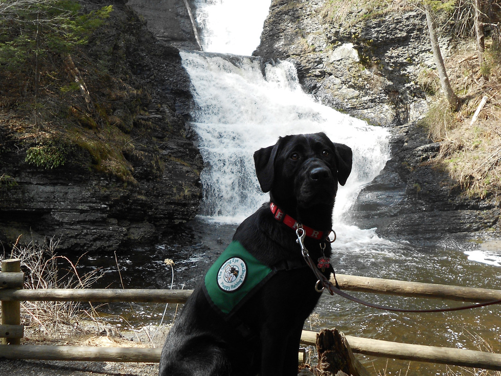 Rutgers, a male black Labrador retriever, sits at attention in front of a waterfall. His ears are forward and his green Seeing Eye puppy vest is visible on his side. The waterfall is tiered and empties into a small pool of water behind him. There is also a wooden fence separating him from the pool. He is wearing a red collar with the Rutgers University “R” on it. His amber eyes are staring up and to the right of the photographer.