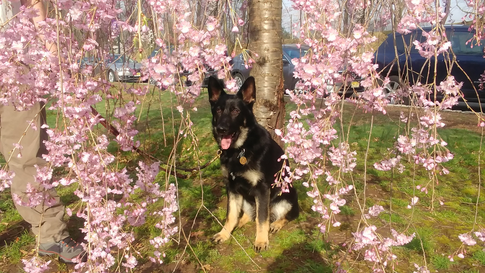 Jingle, a mostly black five-month-old female German shepherd puppy, visited BloomFest at Branch Brook Park. She is sitting on green grass in front of the trunk of a cherry tree. The branches of the tree, covered with cherry blossoms, are hanging down around Jingle framing her. She is on leash and appears to be smiling with her tongue hanging out and her eyes look very bright. Her ears are pointed up and you can see her large copper ID tag with a star on it hanging from her collar. Her legs are tan with black stripes on her toes so it looks like someone drew with a Sharpie marker on each toe.