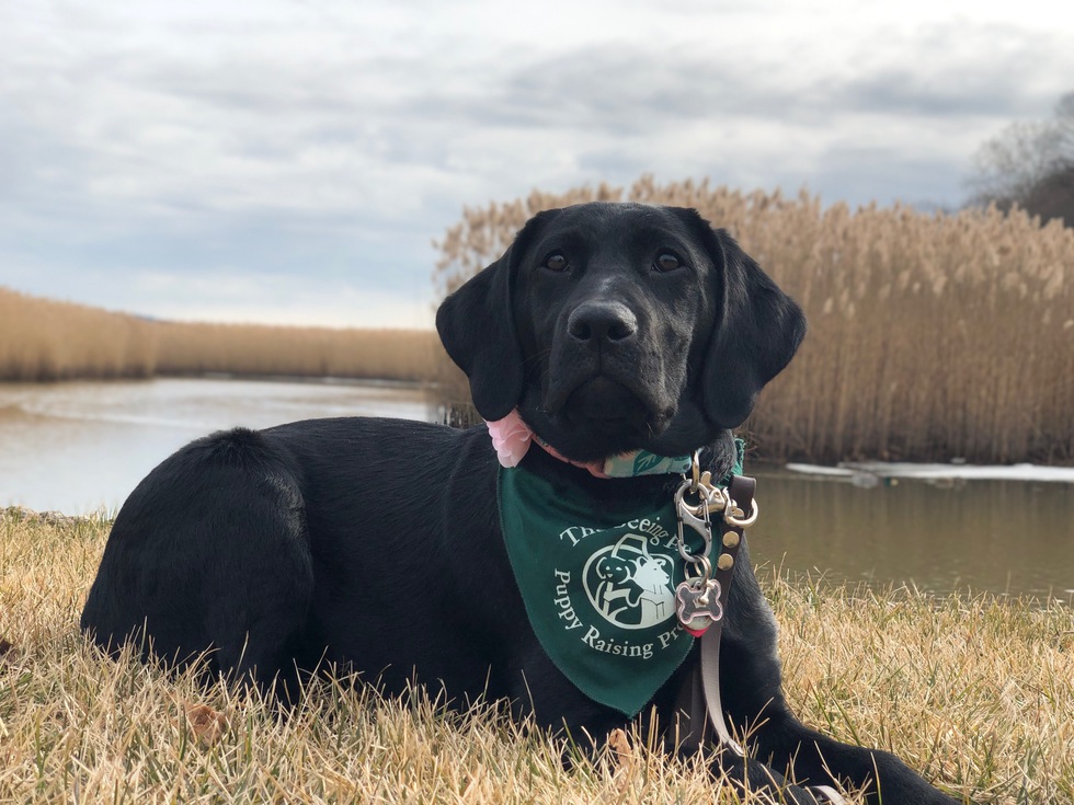 A young black Labrador retriever is lying sideways on beige colored grass and looking above the camera with bright eyes. She is in focus while a beautiful river and wheat grass are out of focus behind her. She is wearing her green Seeing Eye puppy scarf and is on a slack brown leash.
