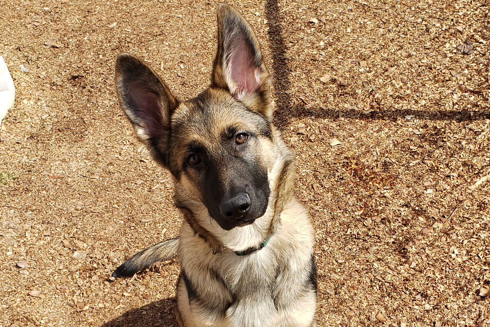 A fully grown male sable German shepherd puppy sits on a bed of woodchips while looking up into the camera with soft, brown eyes. His head tilted towards the left of the photo, the pup’s nearly completely tan chest contrasts with his entirely black snout and eyebrows, and his tall ears are perked upright at alert.