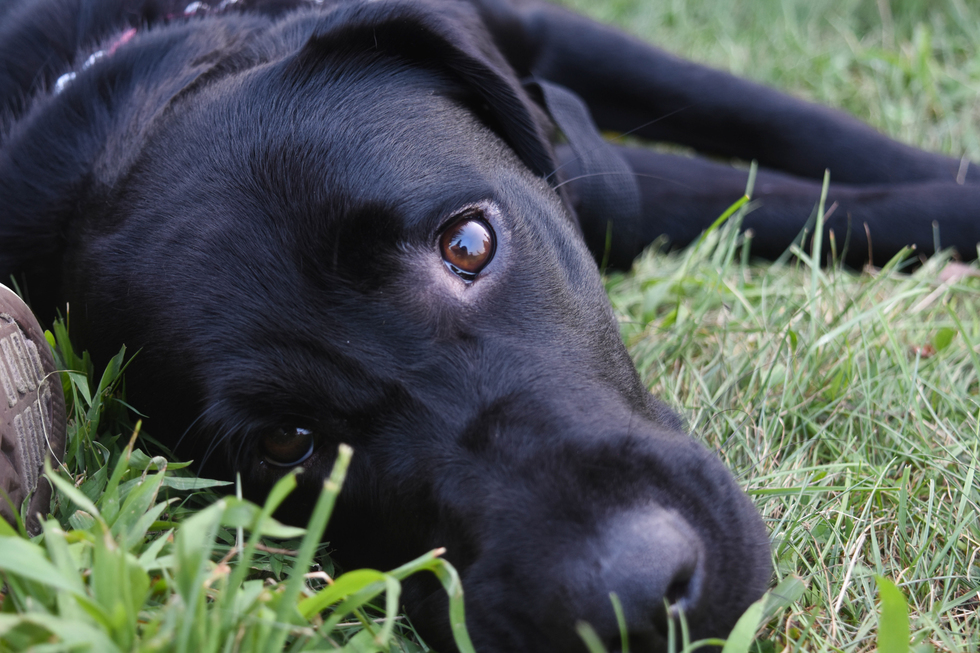Uriel, a black Labrador/golden retriever cross puppy, lays exhausted in the grass on a warm summer day at the annual Passaic County Fair in New Jersey. Her sweet face takes up almost the entire frame of the photo as she gazes at you with clear amber eyes.