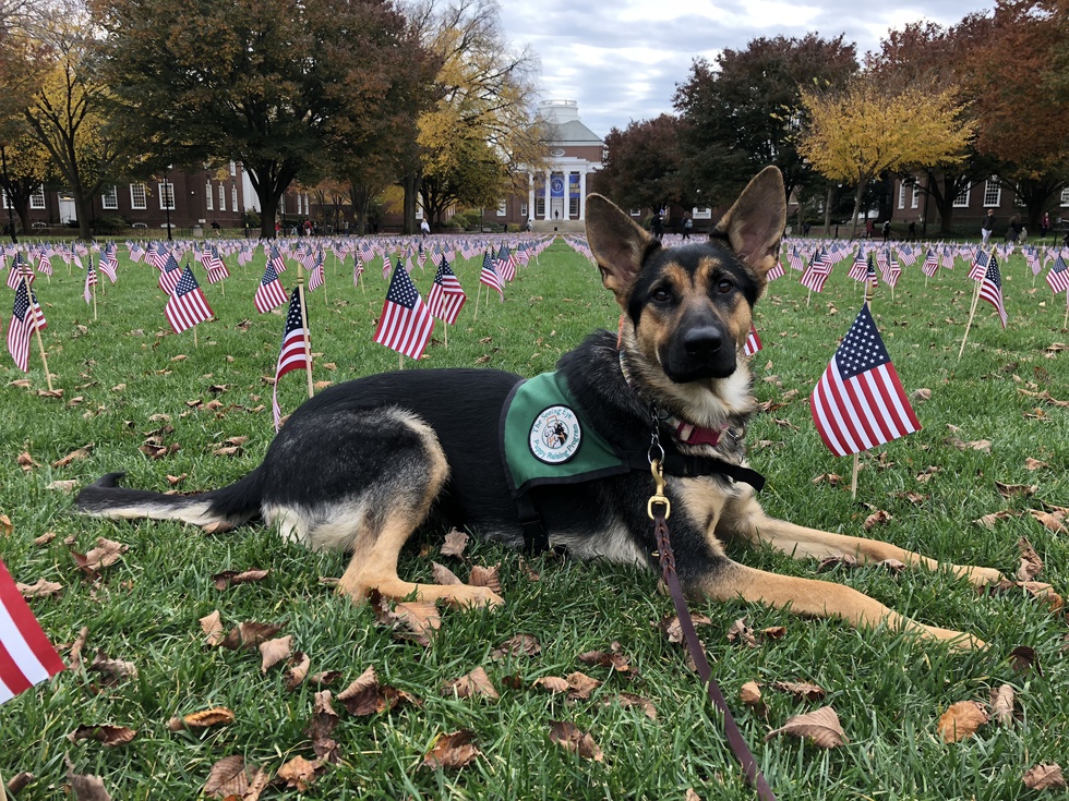 Pictured is Jazz, a one-year-old female black and tan German shepherd. She has a very dark coat, her face has reddish-brown markings and her large ears are perked up and pointed toward the sky. She is wearing her green Seeing Eye puppy vest and the full Seeing Eye Puppy Raising Program logo is visible on the side. She is staring sweetly and intently at the camera with her soulful eyes. Her fluffy tail is extended out behind her and she is relaxed while laying down on the University of Delaware's “Green”. The Green is a long field of bright green grass and is decorated with rows of thousands of miniature American flags stuck in the ground. The seemingly endless rows of miniature American flags are visible all throughout the background of the picture. The trees surrounding the Green have turned to beautiful shades of brown, yellow, and orange from the fall weather. Tons of brown crunchy leaves have fallen around all of the miniature flags, adding even more color and dimension to the photo. In the distant background, you can also see a large brick University of Delaware academic building that has four bright white pillars. The light blue sky can be seen at the very top of the photo along with bright white and light grey clouds.