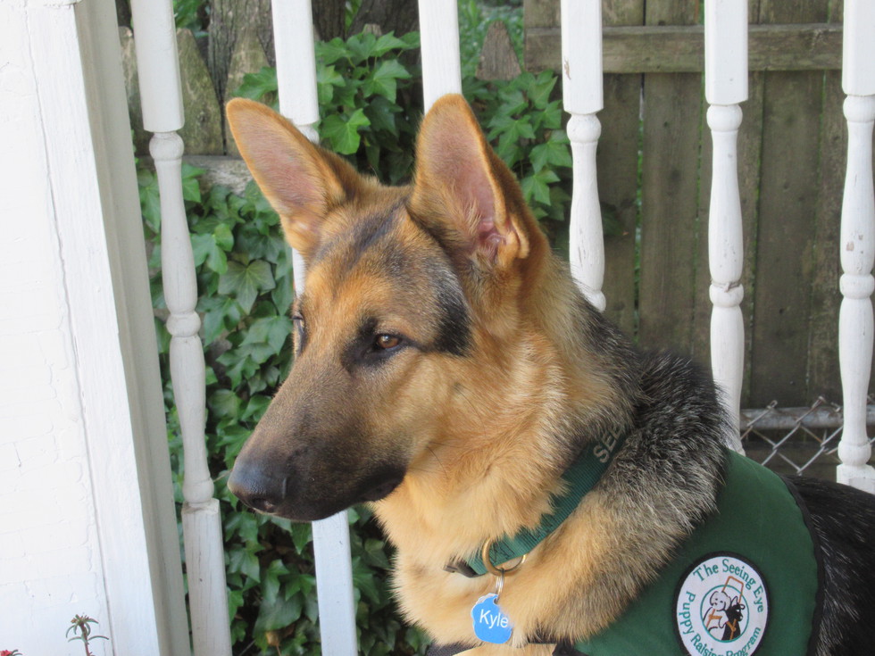 A fully grown male black and tan German shepherd puppy gazes blissfully into the distance from the white wooden porch in his yard. Wearing his green Seeing Eye puppy vest, his face and neck are mostly tan, with some black shading across his forehead and nose. A brown wooden picket fence and a green ivy-covered tree trunk stand directly behind the pup.