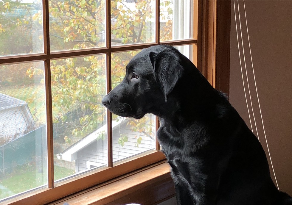A black Labrador/golden retriever cross looks longingly out the window at the crisp winter day waiting for his puppy raiser to return home. His ears are perked forward expectantly and his round, brown eyes are soft and sweet. Outside the window, there is a tree with green and orange leaves.