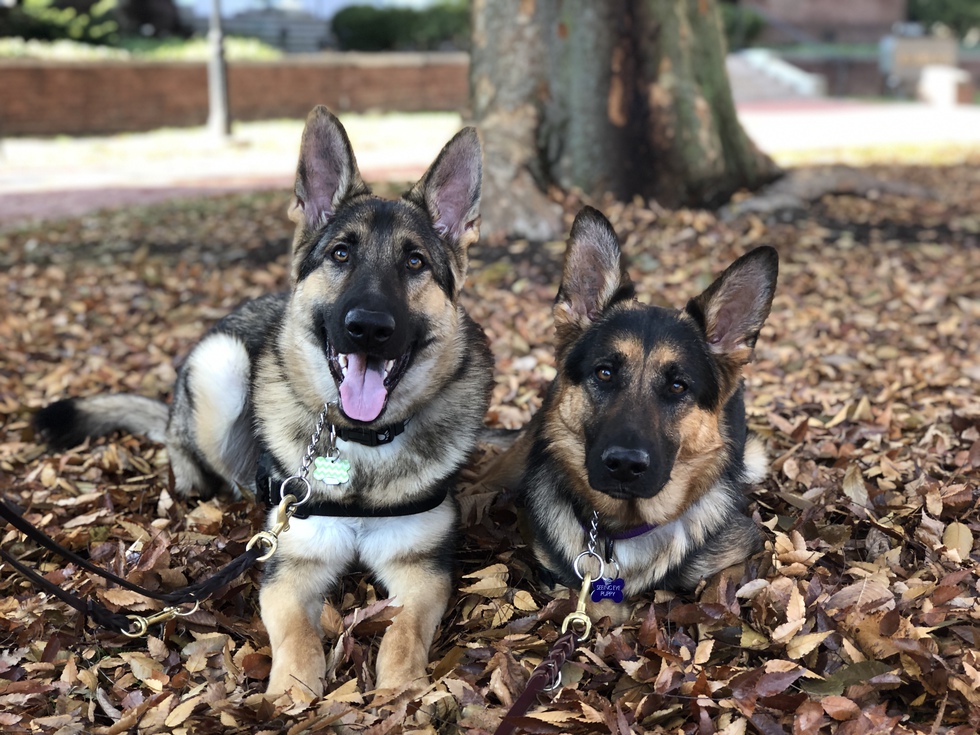 Two older German shepherd puppies, one sable male and one black and tan female, lay side-by-side on their bellies on a bed of crunchy, brown autumn leaves. Both have their tall ears perked at alert while their heads are slightly tilted and are looking directly at the camera. Benson, on the left, is smiling cheerfully while Florence, on the right, is gazing curiously at the camera. In the unfocused background, highlighted by the sunlight, there is a red brick walkway and the base of a large tree trunk.