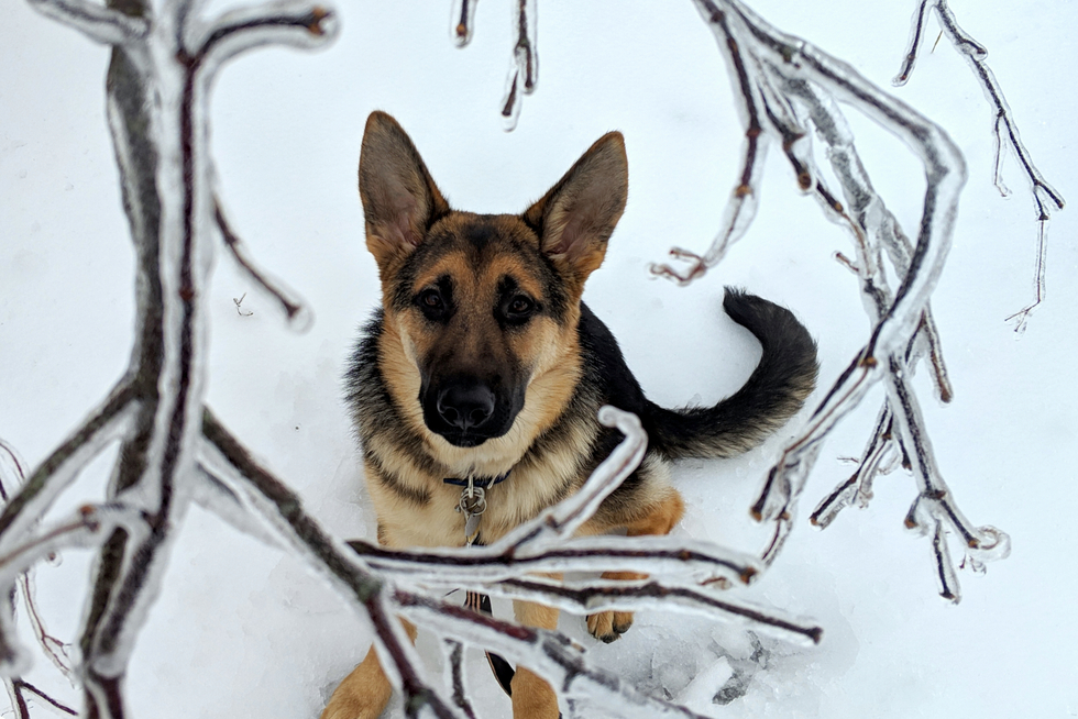 A six-month-old black and tan male German shepherd sits in the fresh white snow, looking intently up at the camera. His deep brown eyes are soft and sweet while spindly, ice-covered branches of a red maple tree make a frame around the pup’s head and curly tail.
