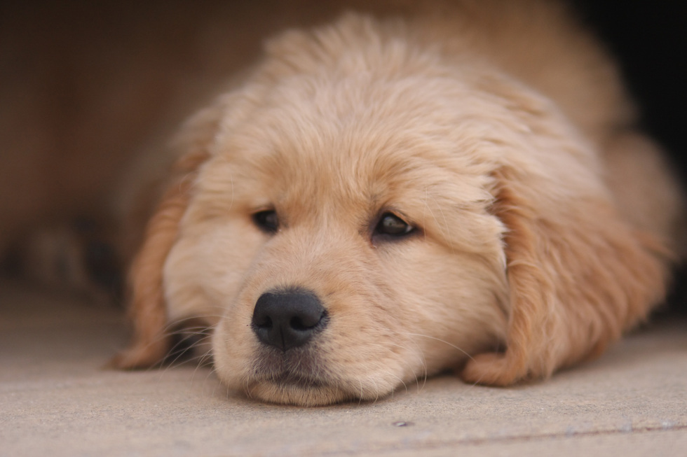 A nine-week-old female golden retriever rests on her back deck. The photo is an extreme close-up of her sweet expression. Her chin is resting on the deck and her furry ears are framing her face. She has a jet-black nose and warm brown eyes.