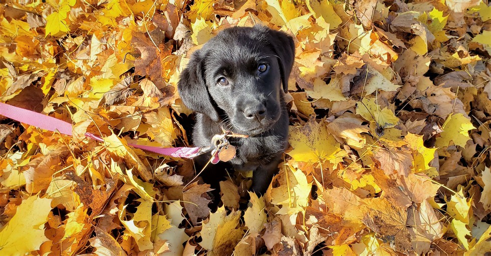 A young female black Labrador/golden retriever cross perches inside of a pile of crunchy yellow and brown leaves. Her face illuminated by sunshine, the pup has her head tilted to the left and is gazing sweetly up at the camera. She is also donning a light pink leash that is lying next to her in the leaves.