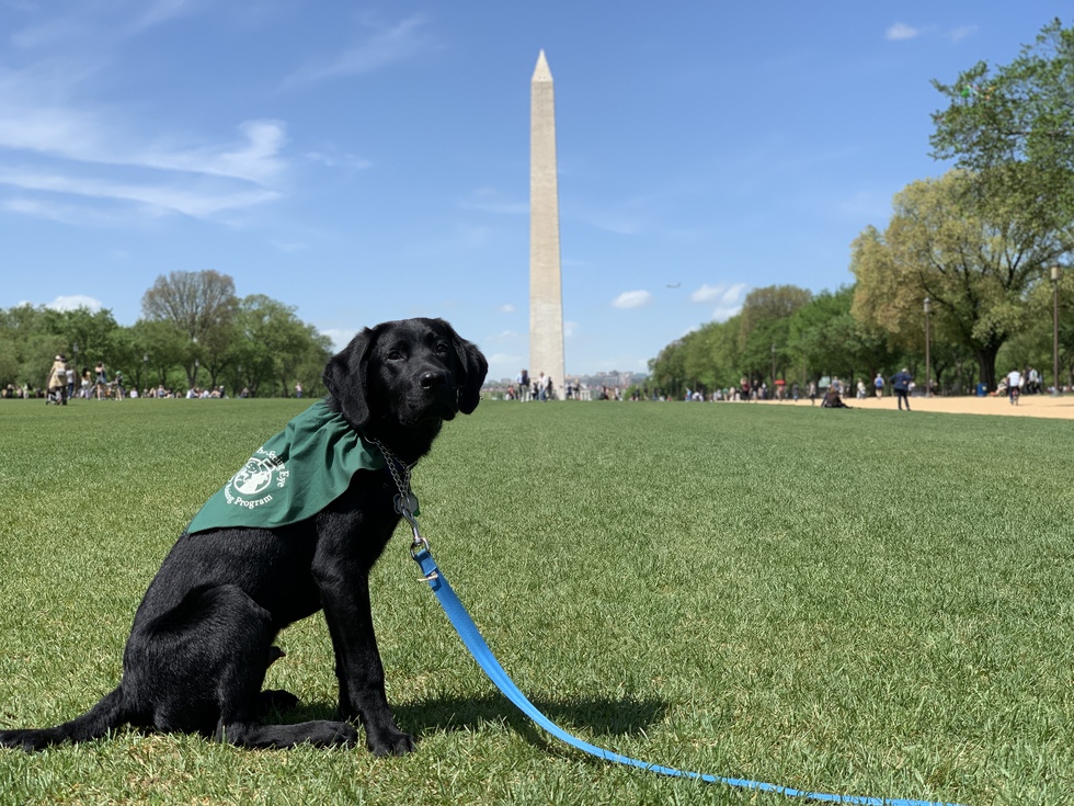 A six-month-old male black Labrador retriever sits on the lush grass of the National Mall in Washington, D.C. in front of the Washington Monument on a sunny spring day. Wearing his green Seeing Eye puppy scarf and donning a bright blue leash, the pup is gazing off to the right of the photo, his sweet face illuminated by the sunshine. Clear blue skies set the backdrop for the photo, in addition to the lush, green trees that run along either side of the monument.