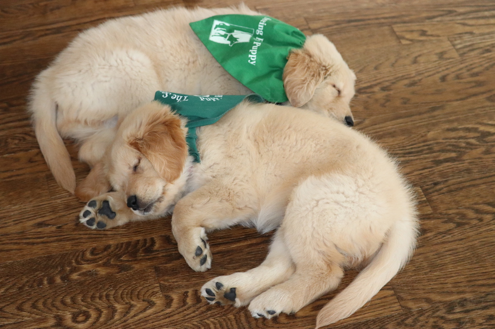 Two golden retriever puppies are nestled together sleeping soundly on a wooden floor. The puppy at the top of the frame is laying on his left side with his head to the right resting it on the other puppy's back. He is wearing a green Seeing Eye puppy scarf. The puppy on the bottom is laying on her right side with her head resting on the side of her right paw, which is stretched out in front of her face. You can see a portion of the logo on her green Seeing Eye puppy scarf. Both puppies are a light golden color and their ears are a darker appearance like they were dipped in caramel. Their tiny jet black noses add some contrast to their light colored fur.