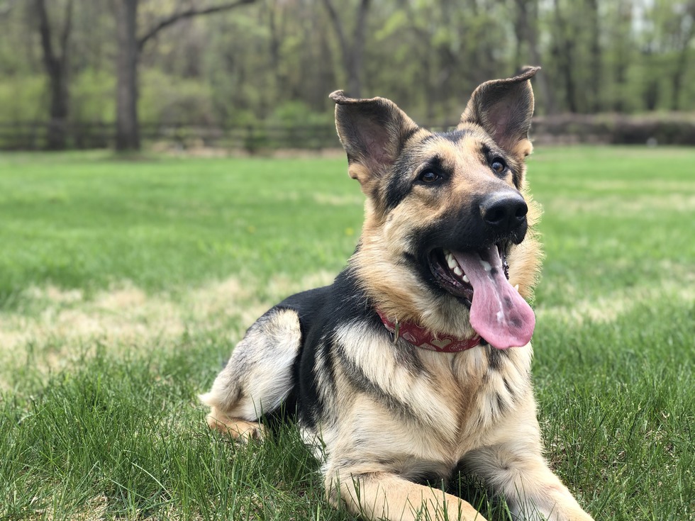 Valentine, a striking black and tan German shepherd, lies on a bright grassy lawn. She is looking just off to the right of the camera with a big smile on her face. Her large pink tongue hangs out between white teeth. Her elf-like ears curl slightly at the tips. She is living up to her name wearing a red collar adorned with hearts. You can see a blurry split rail fence and a line of trees in the background.