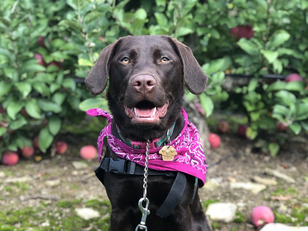 A petite female chocolate Labrador retriever with a pink nose and light amber eyes is smiling straight at the camera. She is wearing a magenta bandana with her Seeing Eye puppy vest slightly visible. The camera is focused on her silhouette with the background being out of focus. She is standing in front of bountiful apple trees with some fallen apples scattered on the ground around her.