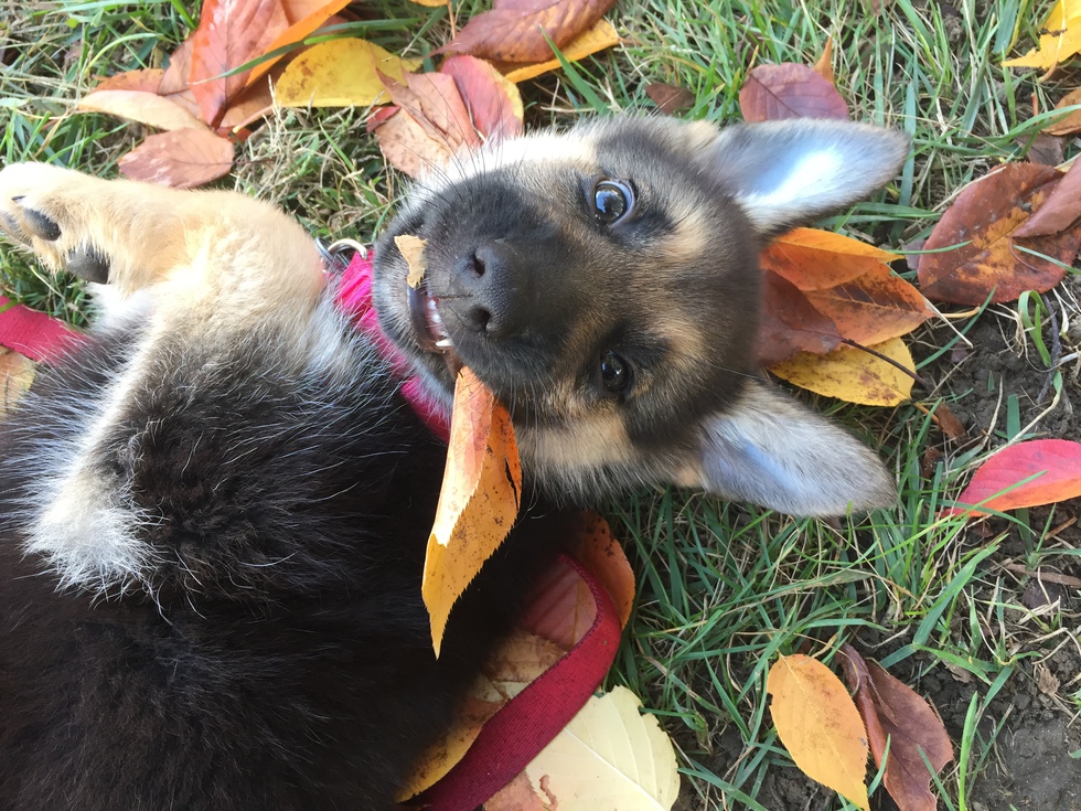 A fuzzy, eight-week-old female black and tan German shepherd rolls around in the colorful autumn leaves. Her tiny ears are pointed straight up, and she has a yellow leaf clenched between her teeth as she gazes playfully at the camera.