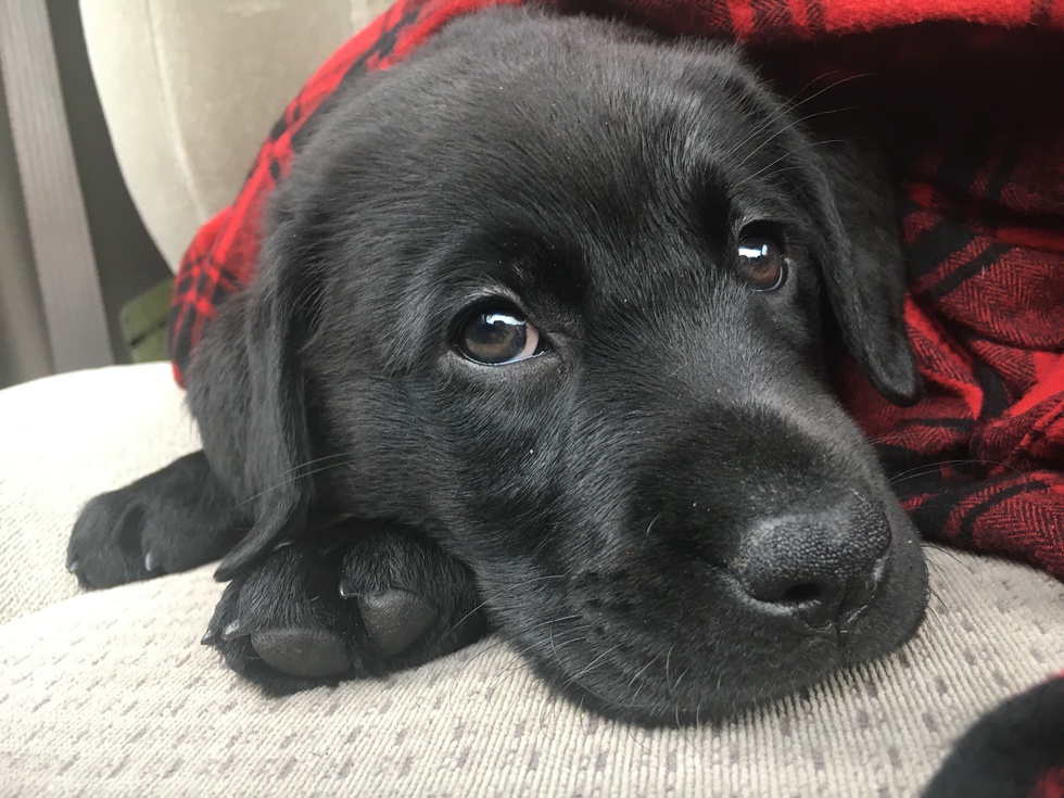 This picture is a close-up of a young black Labrador retriever puppy. He is resting with his head on his paws and is wrapped in a red and black plaid blanket, looking up at the camera with warm, brown eyes.