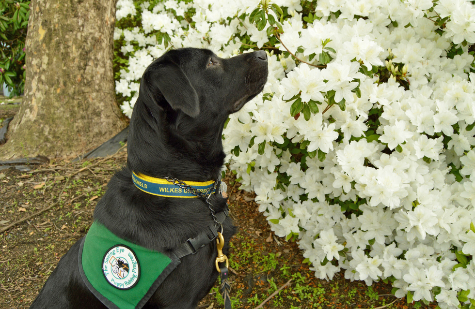 A handsome black Labrador retriever is sitting in profile, facing a bush of bright white flowers. He is wearing his green Seeing Eye puppy vest and a blue and yellow collar. His black leather leash is trailing down to the ground.