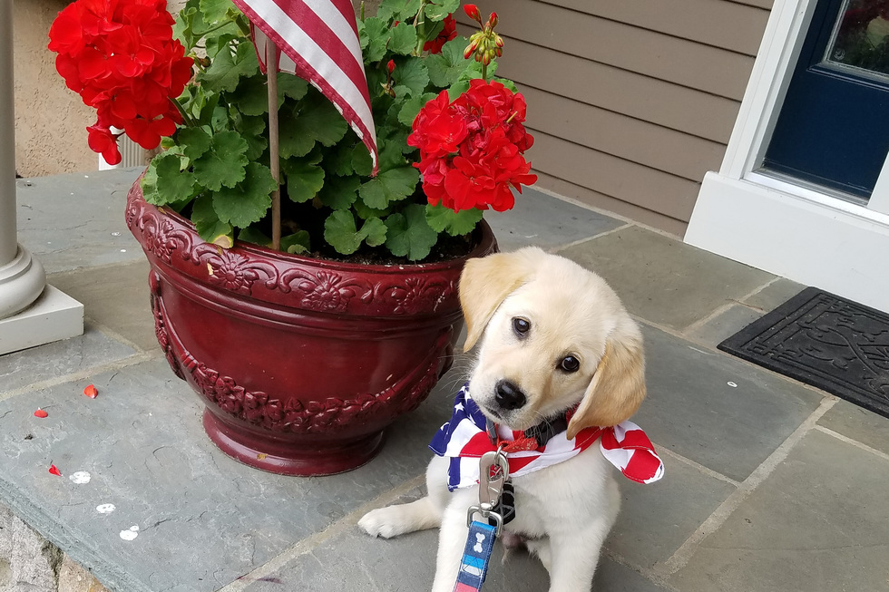A petite, young female yellow Labrador/golden retriever cross sits on her front porch next to a pot of scarlet red flowers. Wearing an American flag-printed bandana around her neck, this patriotic pup is tilting her head towards the right of the photo while looking curiously up at the camera. There is also a small American flag stuck into the soil with the flowers.