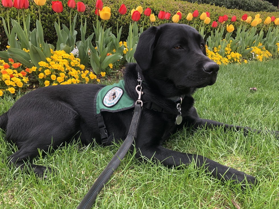 Harry, a very handsome Labrador retriever with a shiny black coat, is pictured lying on a bed of green grass in front of a glorious line of bright red and yellow tulips. He is wearing his green Seeing Eye puppy vest and is looking off in the distance with a very alert look on his face.