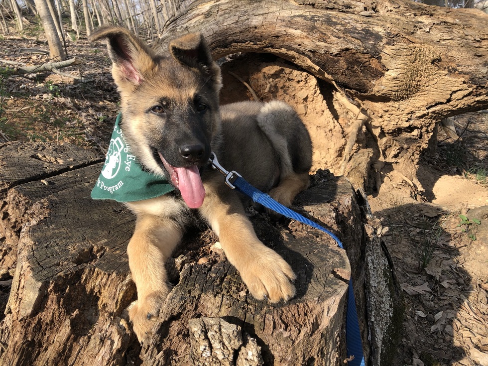 Wilhelm, a thirteen-week-old sable German shepherd puppy, relaxes on an old tree stump after an early spring walk through the woods. Neither one of his ears are upright yet. The right one is slightly bent and the left one struggling even more to stand. His large paws predict that he will grow to be a big boy. He is looking at the camera with his cute little pink tongue lolling. The green Seeing Eye puppy scarf is visible on his right side and the attached blue leash is hanging off the stump to the puppy’s left.