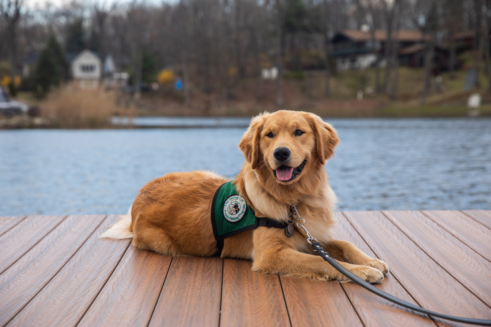 Pictured is Shae, an exquisite 11-month-old golden retriever pup who is laying on a smooth, brown wooden dock. He is wearing his green Seeing Eye puppy vest, which stands out nicely against his gorgeous golden-brown fur. His face appears as though he is smiling, with his pink tongue just peeking out from his open mouth. He is looking directly at the camera with a twinkle in his soft brown eyes. In the background you can see a clear blue lake with calm water, a couple of houses and some trees. The background is a bit blurred in contrast to the crisp image of Shae.